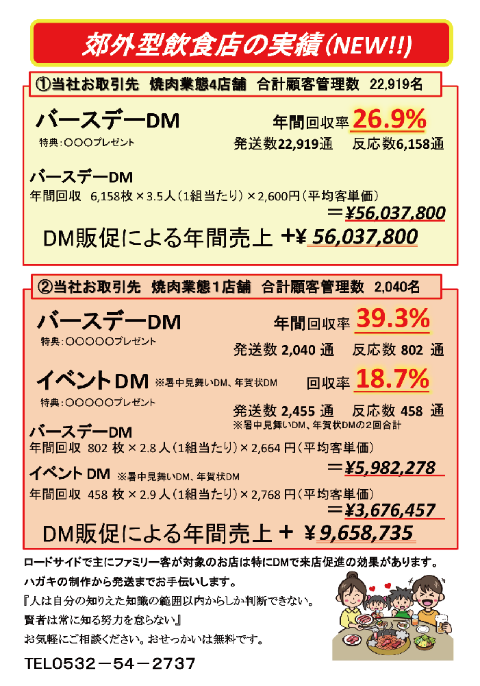 ロードサイドで主にファミリー客が対象のお店は 特にハガキでの販促で来店促進の効果があります 制作から発送までお手伝いします